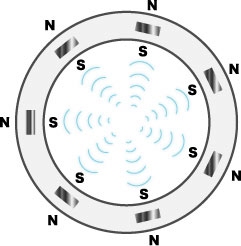 - 磁體安排 - 七塊磁體的安排為北極向外,南極向內。